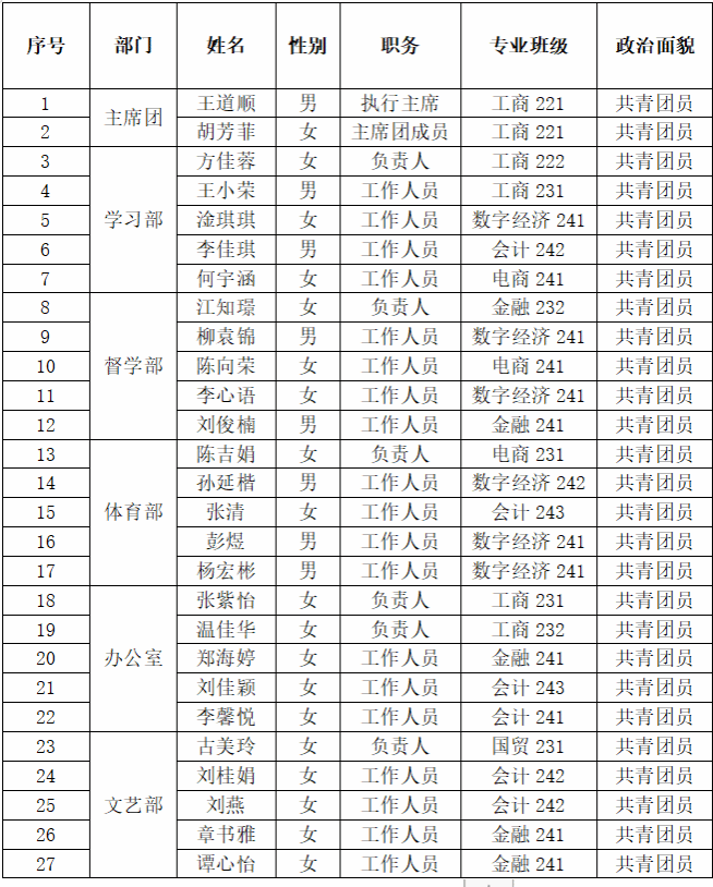 欧冠官方网站入口学生会严格遵守《欧冠官方网站入口学生会章程》,明确成员遴选条件,所有成员均思想政治素质高、学习成绩优良,无课业不及格情况,且综合成绩排名位列专业前30%。具体情况如下表所示: