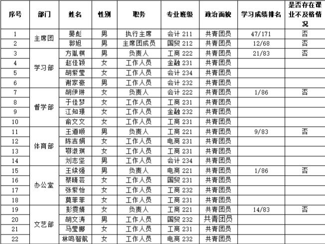 经济管理系学生会严格遵守《经济管理系学生会章程》,明确成员遴选条件,所有成员均思想政治素质高、学习成绩优良,无课业不及格情况,且综合成绩排名位列专业前30%。具体情况如下表所示: