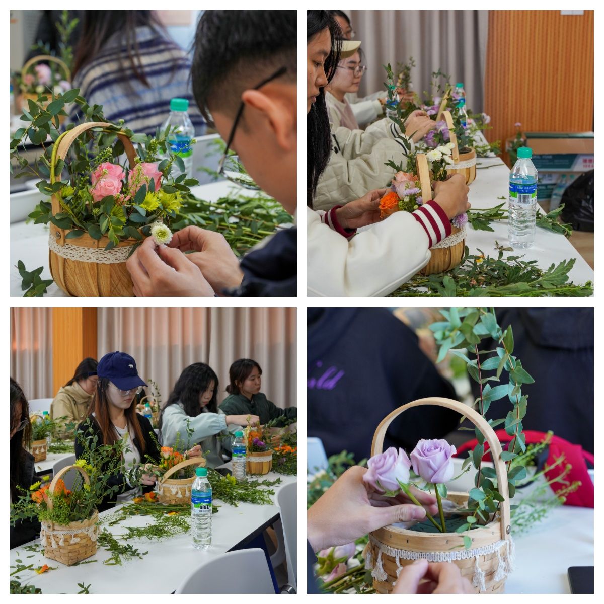 活动现场,李老师细致地为同学们讲述插花艺术的历史变迁、中西方异同及宋韵插花的理论知识,通过学习与创作融入诗词、绘画、器物等多元艺术元素的插花作品,使师生们在领略传统文化魅力中提升艺术鉴赏力。随后,在李老师的示范插花和亲身指导下,同学们躬身入局、细嗅花香、体悟古韵,亲手创作属于自己的“小蓝花”。到场师生从精心挑选花材,到耐心修剪枝叶,凭借创造力与审美,将原本零散的花材组合成一件件风格各异、独具匠心的插花作品。这不仅锻炼了同学们的动手能力和操作技能,还学会将创意转化为现实,提升实践能力、淬炼专注品质。