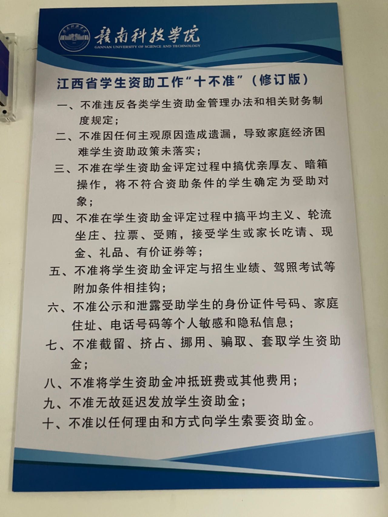 在新民楼经管学院办公区域的显眼位置,悬挂了江西省学生资助工作“十不准”宣传板,通过图文并茂的形式,提醒广大师生在资助工作中必须严格遵守“十不准”规定,确保资助工作的公平、公正、公开。