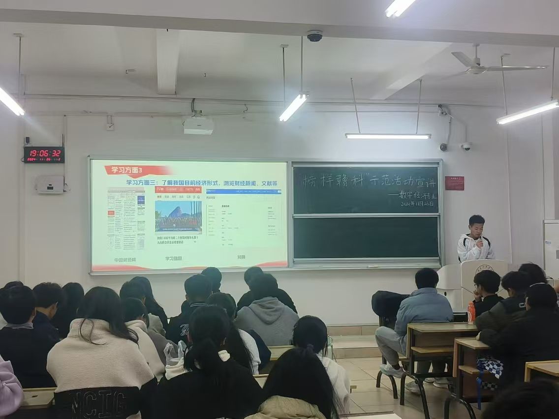 本网讯:为进一步激发同学们的学习热情,从优秀学生榜样中汲取力量,11月25日,欧冠官方网站入口举办“榜样赣科”主题宣讲活动。本次活动邀请获得2024年国家奖学金的涂传同学为大家分享自己的学习经历与感悟,2024级数字经济专业全体学生参加。
