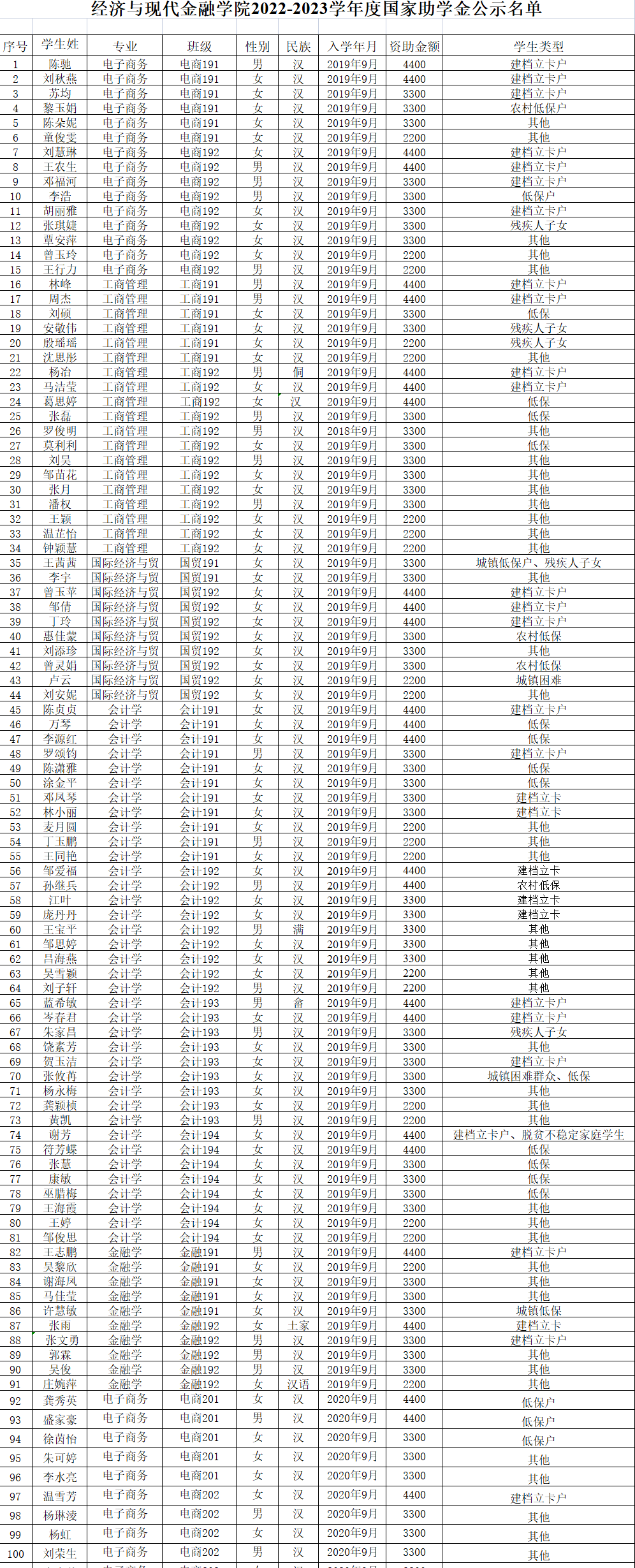 根据《赣南科技学院本科生国家助学金评审实施办法》及学工《关于开展欧冠官网 2022 年国家助学金评定工作的通知》(〔2022〕27号)等有关文件精神,经学生个人申请、班级评议小组评议、系评审领导小组综合考察,集体确定2022-2023学年度我院国家助学金初评人选,现将名单予以公示。