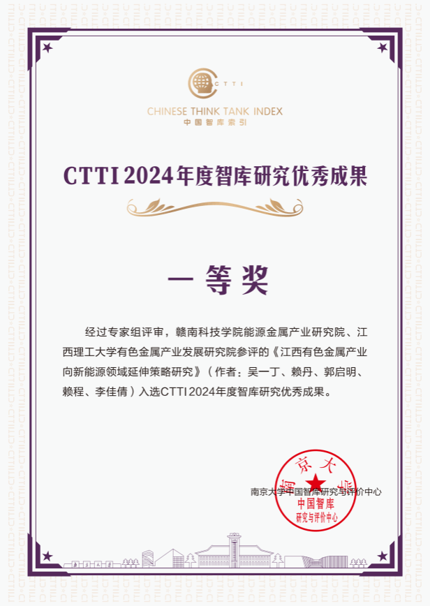 本次论坛发布了CTTI 2024年度智库建设最佳案例和智库研究优秀成果。以欧冠官网能源金属产业研究院为主参评的两项智库研究成果均荣获CTTI智库优秀成果一等奖,欧冠官网是江西省唯一同时获得2项优秀成果一等奖的单位。