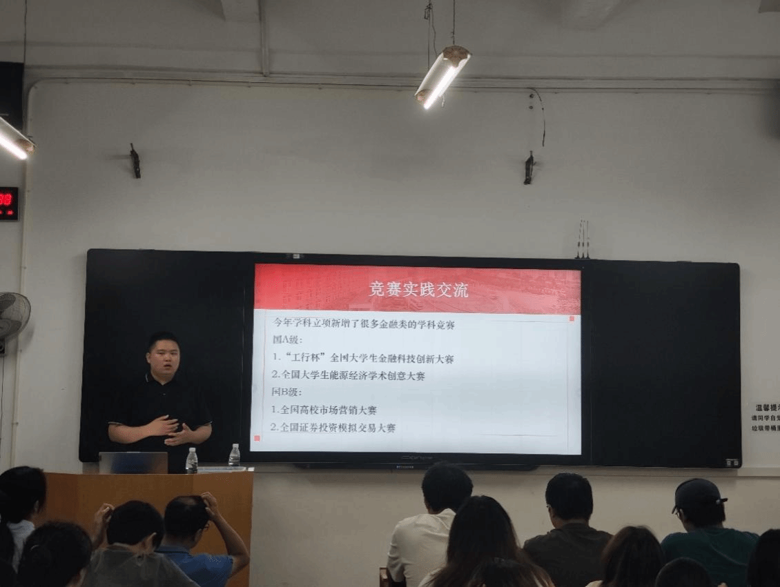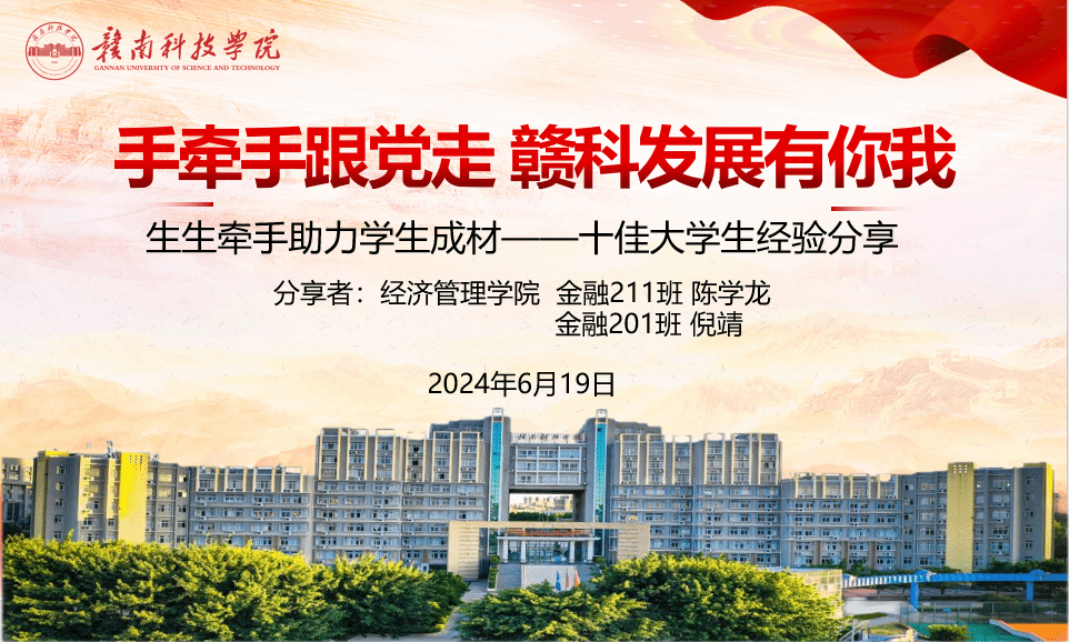 本网讯:6月14日晚,我院金融学专业在红旗校区二教410开展主题为“手牵手跟党走,赣科发展有你我——生生牵手助力学生成材”的十佳大学生经验交流活动。活动邀请学院2024年十佳大学生陈学龙和2023年十佳大学生倪靖为金融学生分享学习成长经验,由金融教研室主任郑延智主持,2023级金融班主任刘宇灏老师参与。