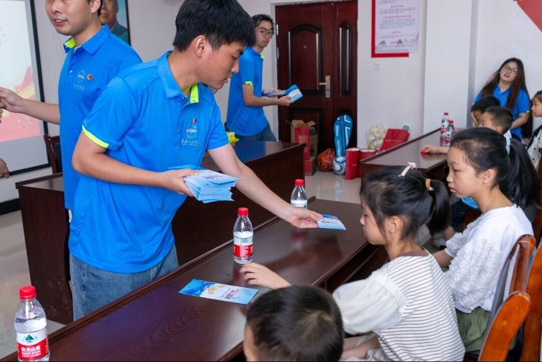 图为蓝鸢队队员们分发防溺水知识手册给小朋友们。中国青年网通讯员 王萍 供图