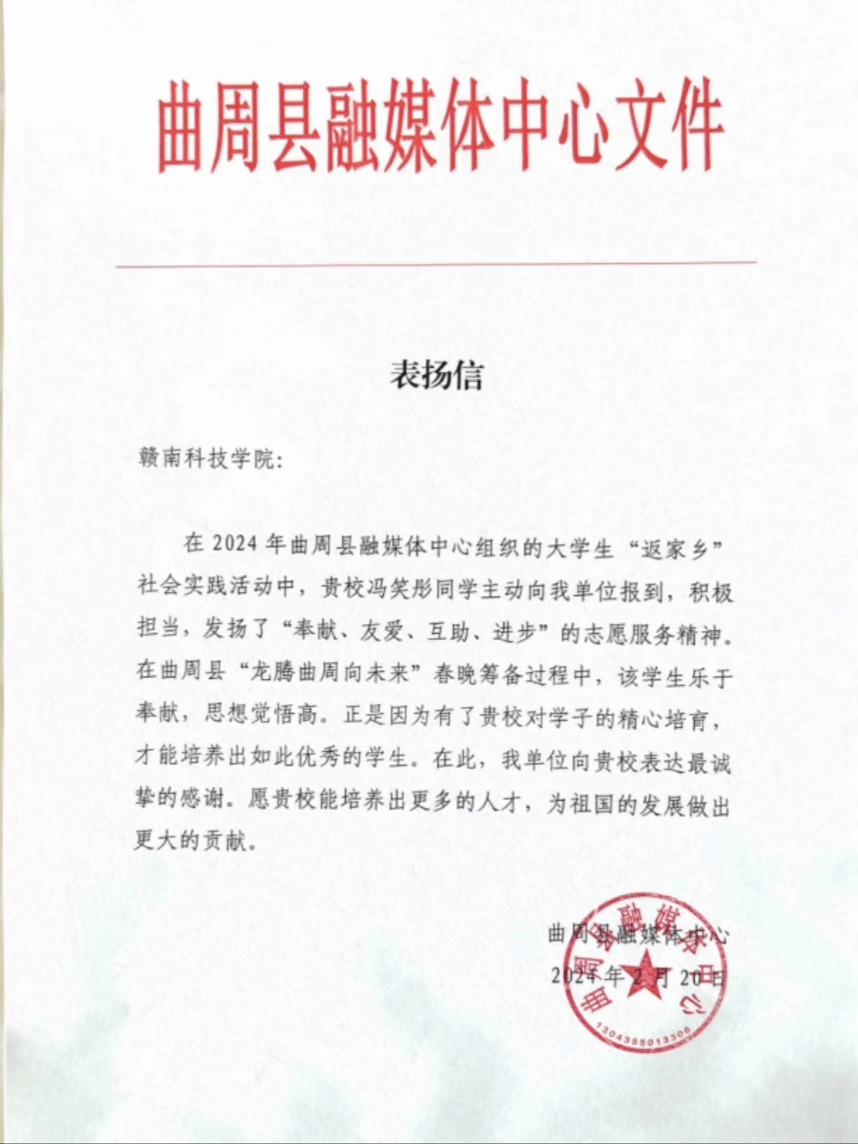 本网讯:近日,我院收到了曲周县融媒体中心发来的表扬信。信中对我院国贸231班学生冯笑彤在曲周县 “龙腾曲周向未来”实习期间的优异表现给予了高度评价,表扬了这位同学严谨认真、吃苦耐劳的优良品质,充分肯定了我院在全面落实立德树人根本任务、着力培养德智体美劳全面发展的优秀人才方面的显著成效。