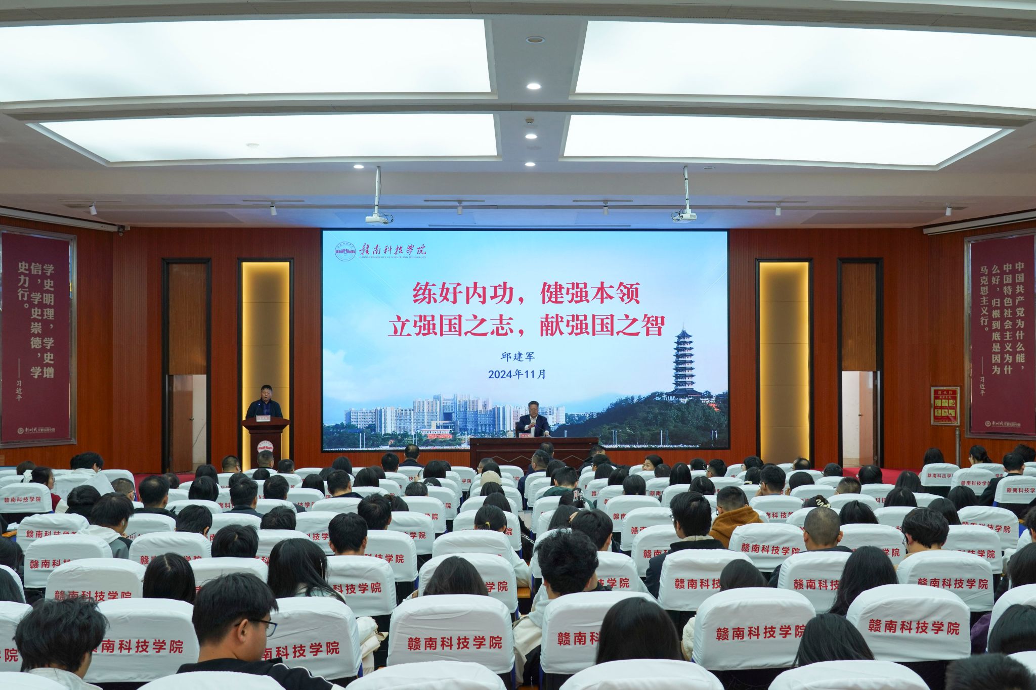 本网讯:11月26日,学校党委书记邱建军在图书馆学术报告厅为欧冠官方网站入口师生作专题辅导报告,围绕深入学习贯彻党的二十届三中全会精神和全国、全省教育大会精神,以“练好内功、健强本领,立强国之志、献强国之智”为主题,勉励师生努力学习本领、增长才干、勇于实践,奋力推进革命老区高质量发展示范区建设,为谱写中国式现代化江西篇章贡献青春力量。学校党委委员、纪委书记陈文新,欧冠官方网站入口班子成员、全体教师和学生代表约350人参加报告会。